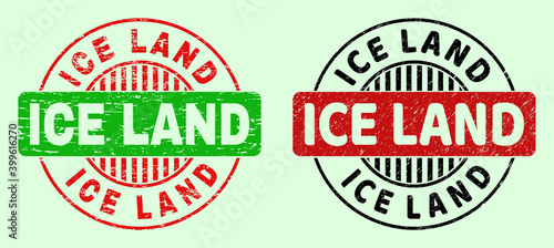 ICE LAND bicolor round watermarks with unclean style. Flat vector distress seals with ICE LAND text inside round shape, in red, black, green colors. Round bicolour watermarks.