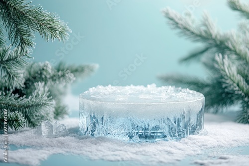 Ice podium with pine trees background for mockup display or presentation of products. with generative ai