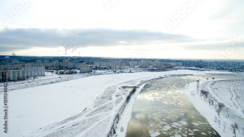 Ice swims in the river. Winter landscape photographed from above near the city. Top view. Nature and abstract background