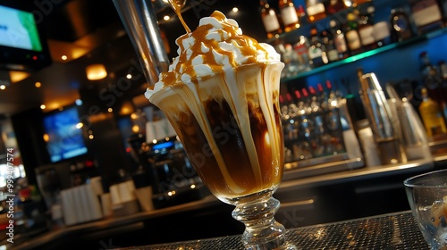 Iced Coffee with Caramel Drizzle and Whipped Cream at a Bar