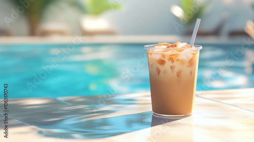 Iced latte coffee by the swimming pool on a beautiful sunny day