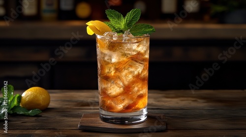 cocktail, iced, tea, drink, bar, lemon, mint, garnish, ice, wooden, brown, dark, eatery, summer, refreshment, beverage, luxury, delicious, brown background, closeup, iced tea, cocktail bar, hot drink, cold drink, high-quality, tasty, iced coffee, drink, relaxation, enjoy, enjoying