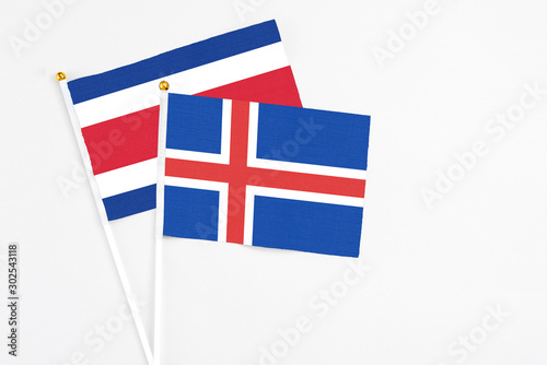 Iceland and Costa Rica stick flags on white background. High quality fabric, miniature national flag. Peaceful global concept.White floor for copy space.