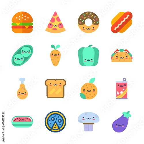 carrot, pizza, toast, hamburger, hot dog, taco, soda, mushroom, watermelon, pea, orange, aubergine, bell pepper, donut, icon, vector, illustration, set, pictogram, symbol, signs, design, art