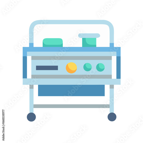 hospital, medicals, equipment, machine, device, health care, clinic, modern, flat, stylised, wheel, control panel, technology, cart, service, patient, illustration, icon, digital, blue, teal, orange, grey, rectangle, circle, rounded, container, emergency, treatment, design, simple, clean, geometric, shape, transport, portable, laboratory, tool, system, bed