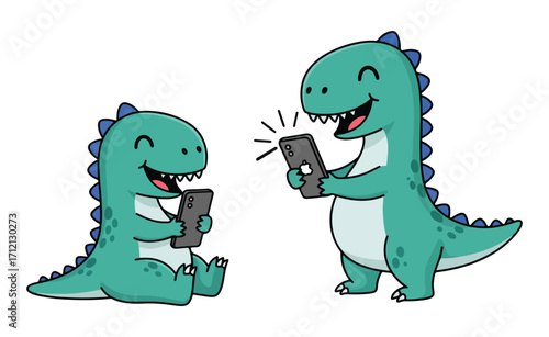 cartoon, animal, dinosaur, dragon, crocodile, vector, reptile, illustration, green, monster, dino, lizzard, alligator, art, drawing, cute, funny, fun, character, baby, iguana, smile, design, tyrannosaurus, tyrannosaurus, icon, cartoonish, dinosaur, against, plain, white, left, sitting, with, phone, tiny, arm, happily, looking, right, standing, holding