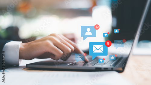 icon on laptop show notifications of new messages,internet application notification concept,Cyberspace Communications, Connected Inboxes, Chats, Messages, and Apps