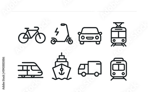 transportation, icon, set, bicycle, scooter, car, train, ship, bus, vehicle, travel, commute, journey, electric, transport, mode, simple, line, outline, minimal, graphic, design, illustration, symbol, collection, logistic, mobility, wheeled, conveyance, public, private, infrastructure, nautical, terrestrial, urban, transit, passenger, freight, motor, sustainable, connectivity