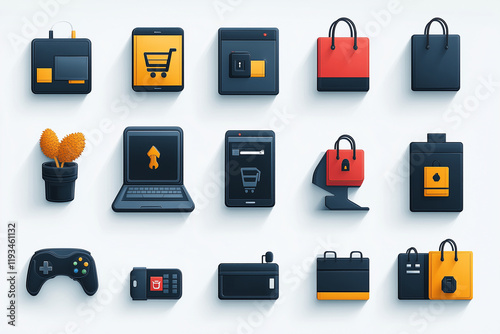 Icon set showing different phases of B2C shopping browsing, selecting, and buying. Bright lighting, contrast