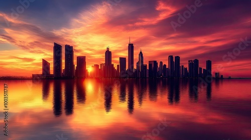 Iconic city skyline silhouetted against a glowing sunset sky, with reflections shimmering in nearby water.