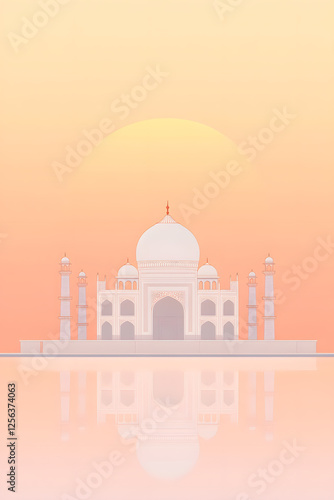 mausoleum, architecture, pastel, sky, symmetry, dawn, water, minimalist, building, landmark, illustration, structure, dome, arch, pillar, silhouette, art, design, geometric, pattern, light, colours, india, historical building, travel, tour tourism, heritage, culture, historic, peaceful, serene, stillness, quiet, contemplative, spiritual, stylised, graphic, rendering, vista, horizon, sunrise, islamic, persian