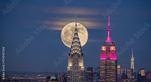 skyscraper, building, city landscape, urban, architecture, skyline, metropolis, night, moon, full moon, celestial, astronomy, illuminated, light, glowing, tall, structure, iconic, landmark, famous, historical, art deco, modern, dusk, twilight, evening, beautiful, scenic, view
