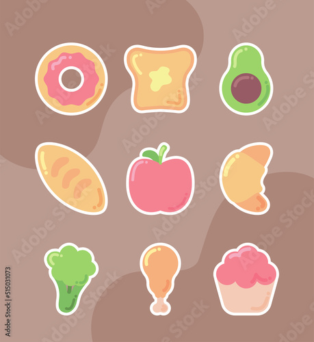 food, avocado, donut, apple, cupcake, broccoli, bread, meat, drink, kitchen, fast, breakfast, bakery, fruit, lunch, nature, flat, meal, vector, illustration, design, icon, icon, set, collection
