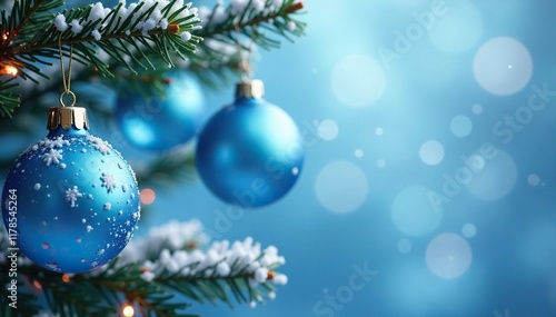 Icy blue glass ornaments hang from branches of a Christmas tree, festive colors, blue and white theme, frosted glass balls