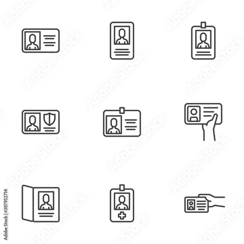ID card line icons set. Identity card linear style symbols collection, outline signs pack. vector graphics. Set includes icons as passport document, security identification badge, driving license