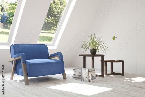 Idea of white room with armchair and summer landscape in window. Scandinavian interior design. 3D illustration