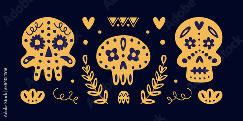 skeleton, day, dead, skull, decoration, floral, festival, abstract, flower, confetti, gold, gold, black, dark, holiday, ornament, mexico, traditional, party, latino, aztec, day of the dead, symbol, mexican, ethnicity, carnival, vector, flat, illustration, element, icon, drawing, art, isolated, modern, trendy, set, clip art