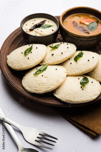 Idli Sambhar or Idly Sambar is a popular south Indian food, served with coconut chutney. selective focus