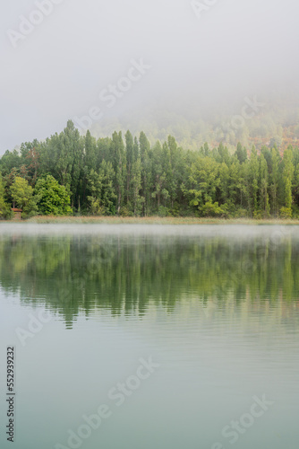 Idyllic landscape about a lake with some fog and surrounded by green trees