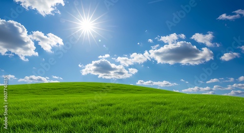 Idyllic summer landscape featuring a rolling green hill under a radiant sun, fluffy clouds, and a vast blue sky.