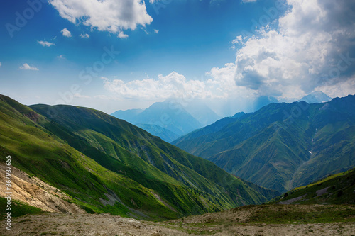 Idyllic summer landscape with hiking trail in the mountains with beautiful fresh green mountain pastures.