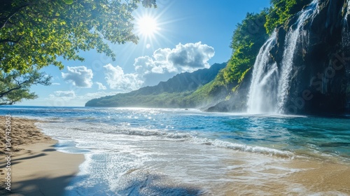 Idyllic tropical beach meets majestic waterfall under sunny skies