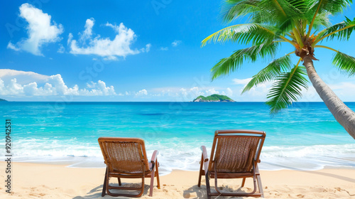 Idyllic Tropical Beach with Palm Trees and Chairs