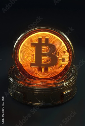 Illuminated Bitcoin Coin on Golden Pedestal, Dark Background