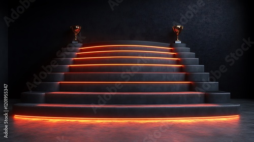 step, stair, black, dark, illuminated, neon, orange, glow, light, trophy, gold, gold, award, prize, winner, victory, success, achievement, competition, contest, gaming, ceremony, stage, platform, pedestal, presentation, futuristic, modern, design, abstract, background, texture, gradient, shadow, empty, space, concept, element, graphic