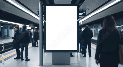billboard, signs, screen, lightbox, display, advertisement, poster, template, frame, signage, people, commuter, passenger, traveler, crowd, woman, man, public, subway, subway, underground, station, platform, terminal, aerodrome, city, urban, modern, interior, architecture, transportation, transit, waiting, standing, commuting, traveling, empty, blank, white, copy space, background, blurred, bokeh, sharpened, depth, field, perspective, composition