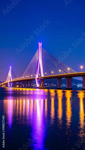 bridge, light, water, dusk, night, cable, structure, transport, architecture, city landscape, illuminated, colourful, purple, orange, dark, serene, modern, engineering, travel, landscape, urban, scenic, calming, symmetry