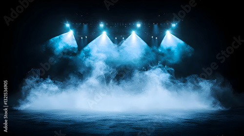 Illuminated Empty Stage With Blue Spotlights And Smoke In Dark Background Dramatic Atmospheric Scene For Performance Or Concert