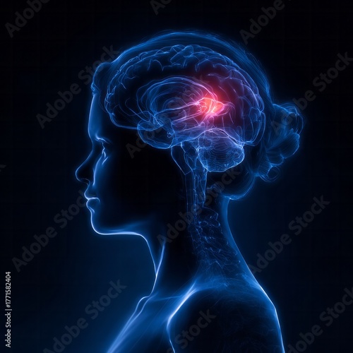 Illuminated female silhouette displays a glowing blue representation of the head and upper body with an emphasized, bright area within the central brain structure