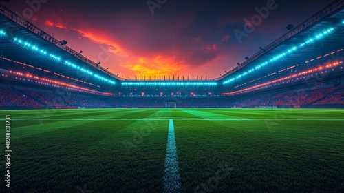stadium, football, soccer, field, green, grass, light, floodlight, sport, game, arena, modern, architecture, seat, row, player, vibrant, twilight, event, match, pitch, illuminated, professional, ambience, energy, tournament, athletic, team, league, ground, championship, fan, fisheye, cinematic, design, steel, technology, score, lighting, competition, realistic