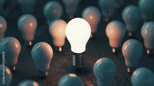 Illuminated Idea, a vibrant lightbulb stands out in a sea of dark, unlit bulbs, symbolizing innovation and problem-solving in a visually striking 3D rendering.