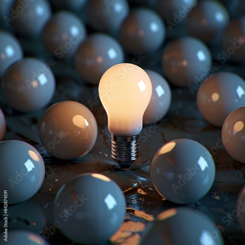 Illuminated light bulb standing out among many unlit bulbs, representing creativity, innovation, and individuality.