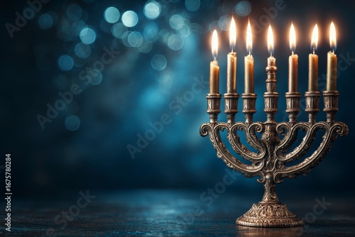 menorah, candle, lit, light, bokeh, dark, blue, background, candleholder, flames, jewish, jew, judaism, tradition, religious, celebration, holiday, shine, glow, glowing, metal, ornate, racked, 7, wax, burning, vintage, antique, culture, festival, spirituality, ritual, decorative, symbol, faith, bronze, gold, old, candlelight, flickering, illumination, history, traditional, religion, cultural, heritage, design, shiny