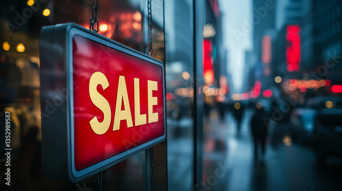 Illuminated Red Sale Sign Displayed Outside Modern Storefront Window with Golden Text in Urban City Environment