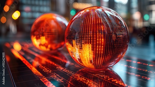 Illuminated Spheres: A futuristic digital art showcasing glowing orbs on a data-rich surface, symbolizing global connectivity and technological advancement