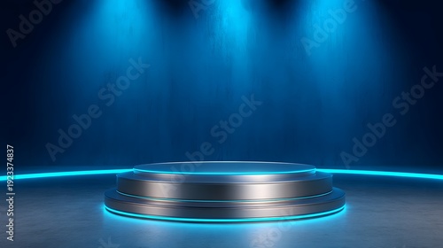 stage, spotlight, blue, platform, presentation, award, display, showcase, event, ceremony, illuminated, spotlight, dais, metallic, lighting, performance, celebration, exhibition, design, modern, futuristic, elegant, empty, announcement, product, launch, reveal, advertising, promotion, opportunity, success, recognition, winner, racked, circular, shape, graphic, space, light, bright, shiny, luxurious
