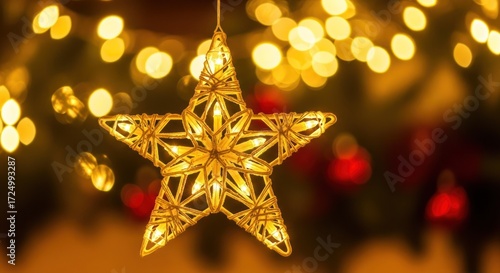Illuminated star ornament glowing with warmth against a bokeh of radiant holiday lights
