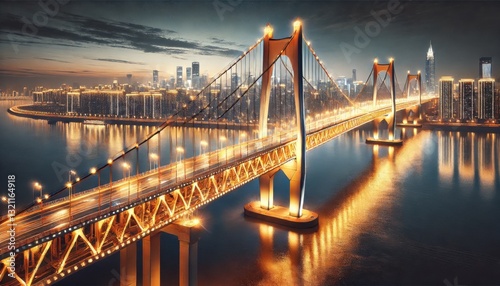 Illuminated suspension bridge over a river with a modern city skyline at night. Urban architecture with golden lights reflecting on water.