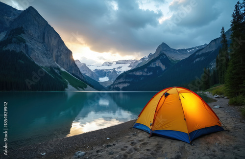 Illuminated tent sits by calm turquoise lake at dusk. Towering mountains, pine forest, and dramatic sky surround campsite. Serene natural scene perfect for adventure, escape.