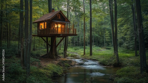 treehouse, forest, tree, wood, timberland, cabin, wooden, light, window, evening, dusk, nature, green, leaf, branch, creek, stream, water, flowing, mossy, rock, ground, foliage, shadow, dark, peaceful, serene, secluded, rural, wilderness, summer, rustic, magical, enchanting, dreamy, get-away, escape, solitude, calmness