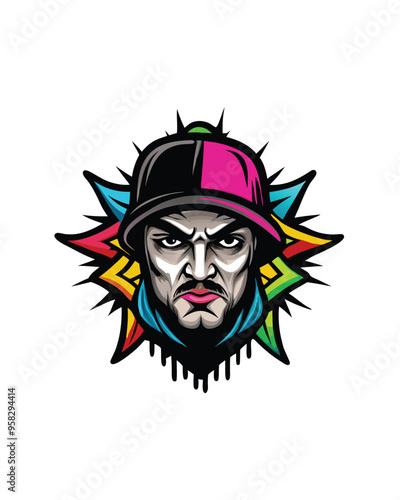 Illustrate a dynamic urban street art design with a bold, graffiti-style face in a cap, surrounded by colorful geometric shapes and drips.