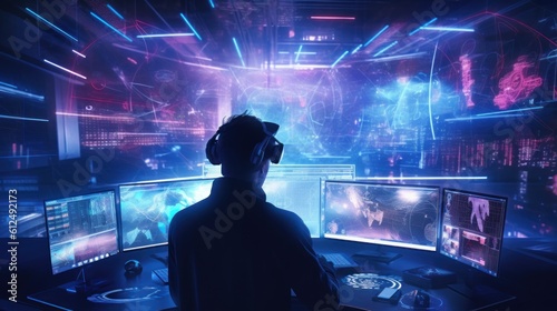 Illustrate a skilled hacker navigating a virtual reality interface