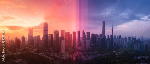 Illustrate a time-lapse inspired still photo, showing a cityscape transitioning from dawn to dusk, capturing the changing colors of the sky