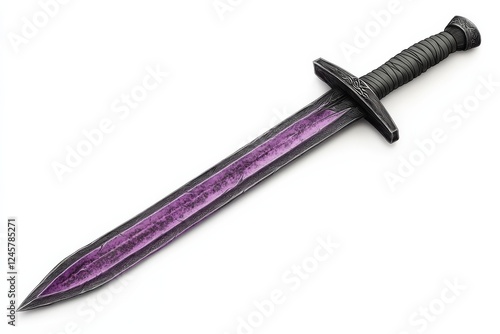 Illustrated fantasy sword with a glowing purple blade and black leather handle isolated on white background symbolizing power and mystery