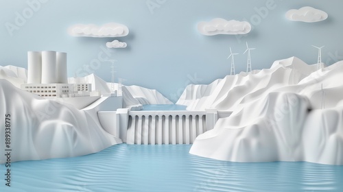 illustrate, landscape, hydroelectric, dam, surround, snowy, mountain, wind, turbine, background, power, plant, picturesque, water, nature, carbon, industry, reservoir, source, footprint, highland, change, grid, scenic, hydro, supply, station, summit, scene, climate, blue, farm, beauty, rural, resource, global, structure, hillside, energy, warm