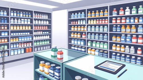 pharmacy, store, interior, shelf, bottle, display, showroom, bright, colourful, retail, scene, aisle, merchandising, layout, glasses, table, illustration, vector, render, three-dimensional, digital, art, design, product, inventory, organisation, lighting, neat, clean, atmosphere
